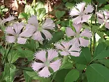 This plant is a rhizomatous perennial herb growing from a thick taproot topped with a woody, branching caudex. There are several stems and shoots measuring up to 40 centimeters in length. The lance-shaped leaves are each up to 9 centimeters long by 25 wide and grow in pairs along the stem. The inflorescence usually has three flowers. Each flower has five pink or white fan-shaped petals with fringed tips, each measuring 1.5 to 2.5 centimeters long. The base of the flower is encased in a papery 10-veined calyx of sepals.[3] The plant can reproduce vegetatively by resprouting from its rhizome, so what appears to be several plants may be one plant with genetically identical clones.[1]