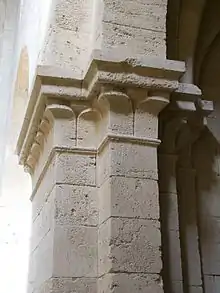 The abbey church was constructed between 1175 and 1230 in predominantly Romanesque style with some Gothic elements on the highest part of the terrain. The building, a basilica with transepts, has a pointed barrel vault, with a plain ribbed vault at the crossing, on substantial cruciform columns, the capitals of which, in the form of very simple foliage motifs, are very finely carved.