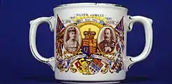 A mug with two handles, displaying portraits of King George V and Queen Mary surrounded by flags and regalia, commemorating the King's Silver Jubilee