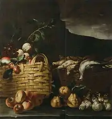 Del Tintore's favoured motifs were wicker baskets laden with fruit and mushrooms scattered about with pale, luminous green leaves transformed into a dense, dark green thanks to the use of chiaroscuro effects.[5]