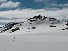 Sinemorest Hill with St. Kliment Ohridski Base in its foothills, and snow-covered Grand Lagoon in the foreground.