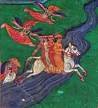 Singha Sartha spread the word among his companions, and they all agreed that they had to flee. The next day before dawn, they slipped out of their rooms and reached the river bank. There was a horse as promised, and they all got on its back. The Bodhisattva had taken the form of the horse to help the merchants escape. As the horse took off for the other bank, the women came running after them, pleading not to be left behind. Their sorrowful cries made the men look back, and they were dragged off the horse. Singha Sartha was the only one who maintained his self-control, and he returned to Nepal safely.[5] [6]