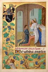 Apart from the Memling, there are two surviving Flemish illuminated manuscripts commissioned by Donne in the British Library, plus a second-hand one (BL MS Royal 15 D iv) that was a gift from the two Duchesses of Burgundy (the widowed Margaret and her stepdaughter Mary) with the inscriptions: "For yet not har that ys on of yor treu frendes Margarete of Yorke" ("Forget not her that is one of your true friends, Margarete of York), and "Prenez moy ajames pour vre bonne amie Marie D. de bourg.ne" ("Take me forever for your good friend, Mary, Duchess of Burgundy"). This was formerly in the Old Royal Library, probably having been presented to Henry VIII by one of Donne's sons.[4] He commissioned an important Book of Hours of about 1480, now known as the "Donne Hours", previously called the "Louthe Hours" due to an incorrect identification of the commissioner of the work,[5] now in Louvain, which has a miniature of him kneeling in armour with his guardian angel with on the same folio a representation of his arms: Azure, a wolf salient argent (as shown on escutcheons on the capitals of the columns in the Donne Triptych by Hans Memling), with crest: A knot of five snakes.