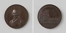 During the Spithead and Nore mutinies, Onslow suppressed a rising aboard the Nassau, and was sent by Duncan to quell the Adamant.[1] When the Nassau refused to sail on 26 May 1797, Onslow moved his flag to the Adamant and until the end of the mutiny, Duncan (in the Venerable) and Onslow maintained the blockade off the Texel alone, making signals to an imaginary fleet over the horizon. Onslow moved his flag again to the Monarch on 25 July 1797, and it was aboard her that he took part in the Battle of Camperdown on 11 October 1797.[1] His flag captain, Edward O'Bryen, supposedly warned him that the Dutch ships were too close together to get between, to which Onslow replied "The Monarch will make a passage." Indeed, Monarch was the first to break the Dutch line and attack the Jupiter of 72 guns, flagship of Vice-Admiral Reyntjes, who subsequently surrendered to Onslow.[1] The victory was captured by the artist Thomas Rowlandson, a friend of Onslow's brother-in-law, Matthew Michell, in the painting "Glorious Defeat of the Dutch Navy Octr 10 1797, by Admirals Lord Duncan and Sir Richard Onslow, with a View Drawn on the Spot of the Six Dutch Line of Battle Ships Captured and Brought into Yarmouth".