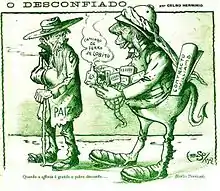 ![]() Caricature by Celso Herminio showing Robert Williams, a contract in his pocket, giving Portugal a railway line in Lobito. | |