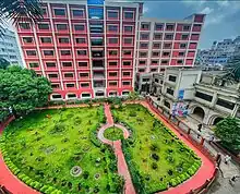 The campus is located at Mitford road, Babubazar, Old Dhaka, historic old part of the Dhaka city.[12] It is spread over about 2.8 acres of land, on the bank of Buriganga river.[13] The medical college building is situated to the south-east of the hospital area, near the river bank with a large garden in front.[14] The building is four-storeyed with a floor space of 4,940 square meters on each floor. The building accommodates the Departments of Anatomy, Pathology, Biochemistry and Microbiology. The Departments of Physiology, Pharmacology, Community Medicine and Forensic Medicine are housed in another building in front of the main building.[7]