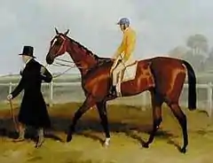 The colt who would become Sir Tatton Sykes was bred near Driffield by a farmer named Hudson. He was a bright bay horse standing 15.2 hands high with large, drooping ears, a white blaze and one white foot and was described as having a "quiet and docile" temperament.[1] He was sired by Melbourne, a member of the Godolphin Arabian sire-line who went on to get the Triple Crown winner West Australian and the outstanding filly Blink Bonny.[2] His dam, an unnamed mare by Margrave went on to produce the important broodmare Lady Elizabeth.[3]