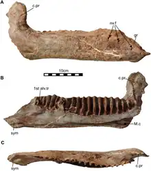 | Right dentary bone from three angles | |