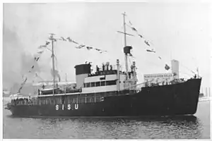 The construction of the new icebreaker was awarded to Sandvikens Skeppsdocka och Mekaniska Verkstads Ab and the work began in March 1937.[4] Previously, the Helsinki-based shipyard had completed the unfinished Voima in 1924 and built a port icebreaker for the city of Helsinki in 1936.[3] On 24 September 1938, the vessel was given the name Sisu, a Finnish word describing will, determination and perseverance, that had been chosen by the Finnish schoolchildren. The sponsor of the vessel was Walborg Jokinen, the wife of the late Captain Ilmari Jokinen.[1] While Sisu was delivered behind the original 20-month schedule and the vessel turned out to be more expensive as predicted, she was generally considered to be a successful design. She was handed over to the Finnish Board of Navigation in March 1939.[3]