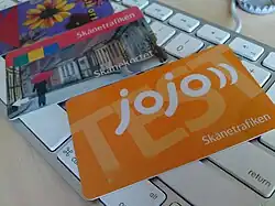 Various Skånetrafiken payment cards. From left: Malmöhus Läns stadstrafik rabattkort, Skånetrafiken periodkort, Skånetrafiken jojo test card