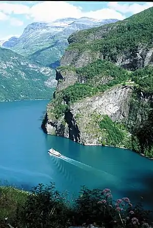 Skageflå is one of a handful of historic mountain farms on the steep mountainsides along the Geirangerfjorden. It is located in Stranda Municipality in Møre og Romsdal county, Norway. Skageflå lies approximately 250 metres (820 ft) above the fjord. The farm is a 2 to 4 hour walk from the nearby village of Geiranger, and can also be reached with help of a local sightseeing boat (M/S Geirangerfjord). The boat takes passengers to a spot on the fjord just below the farm, from where they face a very steep half-hour climb. Coastal Odyssey, a sea kayaking company, runs guided kayaking tours with interpretation to the farm. Active Geiranger also does guided kayak trips to the farm as well as water taxi trips to the trail. Directly across the fjord is the old Knivsflå farm and the Seven Sisters waterfall.[1][2]