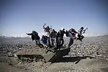 Skateistan pupils and staff jump from a discarded tank on Wazir Akbar Khan hill overlooking Kabul
