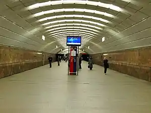 Skhodnenskaya (Russian: Сходненская) is a station on the Tagansko-Krasnopresnenskaya Line of the Moscow Metro. The station is a single vault, which was a significant engineering achievement and a change from the typical functionality design of the 1960s. Actually, Moscow's history of single vault stations began 40 years prior to Skhodnenskaya with Biblioteka Imeni Lenina which opened along with the Metro itself in 1935. Built to a design of the Paris Métro, however, problems of keeping the structure from collapse and pouring in bitumen called for no repeat of such methods. The second single vault, Aeroport, opened in 1938, was built with the cut and cover method, and was not successful. The delicacy required when preparing and handling heavy monolithic concrete vault blocks was labour-intensive and in that period of industrialisation, was not cost affective.