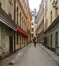 Skräddargränd (Swedish: "Tailor's Alley") is an alley in Gamla stan, the old town in central Stockholm, Sweden. Stretching from Västerlånggatan to Stora Nygatan, it forms a parallel street to Bedoirsgränd and Tyska Brinken.