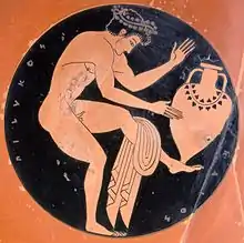 Komast on the tondo of a bilingual cup inscribed ΕΠΙΛΥΚΟΣ ΚΑΛΟΣ, Epilykos kalos ("Epilykos is beautiful"), circa 510/500 BC. Paris: Louvre