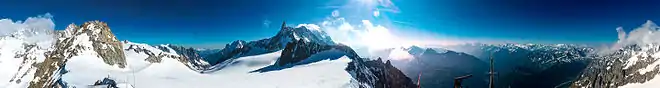 The half-way station of the Pavillon contains a restaurant and conference centre, plus one of the highest botanical gardens in the region, containing some 900 alpine plant species, as well as access to a network of trails. Visitors can continue upwards via a second cable car which also slowly revolves, and takes ten minutes to reach Pointe Helbronner (known as the Eagles Nest) at an altitude of 3,466 meters. Tourist facilities and scenic viewpoints provide close views of Mont Blanc, Aiguille d'Entrèves and the Vallée Blanche, but also views further out towards the Matterhorn, Monte Rosa and Gran Paradiso.[3][2] A tunnel and lift system provide access from the cable car terminus to the Torino Hut, a high-altitude mountain refuge offering accommodation both to tourists and to climbers intending to access the mountaineering routes of the range.[4]