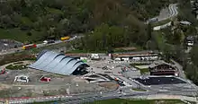The Skyway Monte Bianco was designed by architect, Carlo Rossi, took four years to construct, and involved complete rebuilding of the Point Helbronner terminus at a cost of 110 million euros.[5] The cable cars were manufactured by Doppelmayr Cable Car and the top station was engineered so as to minimise energy consumption, and includes solar panels and highly efficient insulation in order to bring it close to a zero-energy building.[2] The horizontal tunnel and vertical well which now give access to Pointe Helbronner, the Torino Hut and the Vallee Blanche, also serve to anchor the cable car station into the rock. The vertical lift shaft is a 5 metre wide well, approximately 70 m in depth. To avoid damage to the structural integrity of the mountain, explosives were not used during the tunnel's construction. Instead, a series of small holes were drilled, each 40 cm diameter, using a technique known as raise boring. The tunnel and vertical shaft together provide firm anchorage to the cable car equipment, each cable of which has to be capable of carrying loads of over 100 tons. The base of the vertical shaft also houses water tanks for fire-fighting purposes.[4]