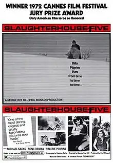 Slaughterhouse-Five is a 1972 American comedy-drama military science fiction film directed by George Roy Hill and produced by Paul Monash, from a screenplay by Stephen Geller, based on the 1969 novel of the same name by Kurt Vonnegut.[1] The film stars Michael Sacks as Billy Pilgrim, who is "unstuck in time" and has no control over where he is going next. It also stars Ron Leibman as Paul Lazzaro and Valerie Perrine as Montana Wildhack.