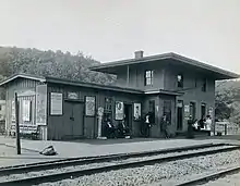 The Erie Railroad was constructed through Sloatsburg from 1836 to 1841, helping with the prosperity of the village, along with its population.[4] The station was also near the Sterlington one, but it never served of great importance.[5] The Sloatsburg station building was built in 1868 as a two-story brick facade with a tin roof. The style of the building, according to the railroad's 1920 engineering report, is a Type 6A style, with dimensions of 17' x 29.5' x 19'. The station was equipped to host as a base for XG Radio from the Suffern Tower (SF) in Suffern.[6] The Sloatsburg station served well for the nearby Greenwood Lake, with a stagecoach leaving the station three times day. The stagecoach was mainly inhabited by fishermen on their way to Greenwood Lake.[7]
