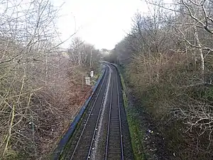 ![]() The site of Smethwick West station in 2018, with overgrown platforms still in situ. | |
