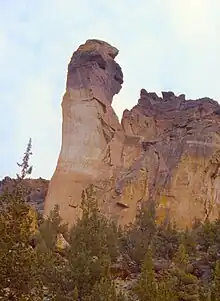 The geology of Smith Rocks is volcanic. It is made up of layers of recent basalt flows overlaying older Clarno ash and tuff formations. Approximately 30 million years ago, a large caldera was formed (Crooked River caldera) when overlying rock collapsed into an underground magma chamber. This created a huge amount of rock and ash debris that filled the caldera. That material solidified into rock, becoming the rhyolite tuff of Smith Rock. Rhyolite dikes intruded along faults in the tuff.[5] A half million years ago, basalt lava flows from nearby volcanoes covered the older tuff.[2][4][6]