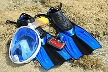 A snorkel is a device used for breathing atmospheric air when the wearer's head is face downwards in the water with the mouth and the nose submerged. It may be either a separate unit, or integrated into a swimming or diving mask. The integrated version is only suitable for surface snorkeling, while the separate device may also be used for underwater activities such as spearfishing, freediving, finswimming, underwater hockey, underwater rugby and for surface breathing while wearing scuba equipment. A standard snorkel is a curved tube with a shape usually resembling the letter "L" or "J", fitted with a mouthpiece at the lower end and made from plastic, synthetic elastomers, rubber, or light metal.[1] The snorkel may have a loop or a clip to attach it to the head strap of the diving mask or swimming goggles, or may be tucked between the mask-strap and the head.[2] Some snorkels are fitted with a float valve at the top to prevent flooding if the top opening is immersed, and some are fitted with a water trap and purge valve, intended for draining water from the tube.