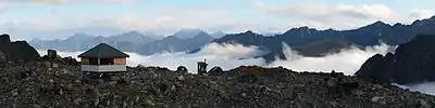 The new hut was designed for free by Rim Architects of Anchorage, Alaska, and completed in 2010 largely through extensive volunteer efforts.[2] The hut is open to the public and free to use year-round.[3] According to the American Alpine Club, "Guests should expect to share the hut with respect and consideration for others. In addition, this hut encourages understanding and cooperation among multiple parties that wish to use it. If additional parties arrive during your stay, please make an effort to accommodate them."[1] The GPS coordinates of the hut are 61 degrees 51.506 North by 149 degrees 12.113 West.[4] Hikers are cautioned not to rely on the hut as their sole source of safety or shelter, because it can be difficult to locate or already full.[2][1]