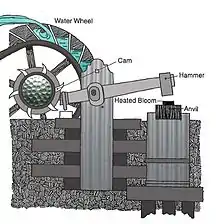 The mountains surrounding Snowville were, and in many places still are, rich with iron ore. One of the first factories established in Snowville was a trip-hammer forge. It was located at the confluence of Little Laurel and Big Laurel creeks (near present-day Blue Ridge Mountains Council property) and was operated by Asiel Snow and his son-in-law, David B. Bill. Cast and wrought iron products were transported to Snowville by wagons and oxen carts. The cast iron was collected as scrap and later made into stoves, kettles, corn shellers, cane mills, and many more other cast-iron products. The wrought iron on the other hand was quickly produced into horseshoes and horseshoe nails, buckboards and buggies, and hearses; it was also used in forgings for sawmills, gristmills, and cane mills.
