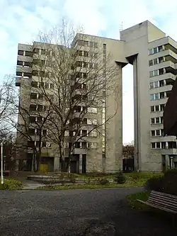 Sobieskiego 100 is located on Warsaw's Royal Route, adjacent to Park Sielecki.[3] It was designed by the Polish architects Janusz Nowak and Piotr Sembrat. Construction commenced in 1977 and the complex was completed in 1978. It comprises two modernist concrete tower blocks (linked by an aerial bridge) that provided approximately 100 "spacious" apartments along with ancillary uses such as a kindergarten, telephone exchange, barber, sauna, basketball court, and movie theater. The taller block is 11 storeys.[2][3][4][5] The complex is surrounded by a steel fence along with a "moat-like" pond to the east. It has been described as "a daring example of avant-garde modernism".[3]