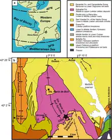 The Castejón de Sobrarbe-41 locality is thought to have been a channel within the tidal zone of the Bay of Biscay, a deep marine gulf located between the Iberian peninsula and mainland Europe during the Eocene. The fact that the bones of Sobrarbesiren are well preserved but disarticulated and widely dispersed has been interpreted by Díaz-Berenguer and colleagues to mean that the channel containing the bones was filled by sediment in a single event, burying the bones instantly. Fossil foraminifera show that sea grasses could be found in the Ainsa Basin during the Eocene.[1]