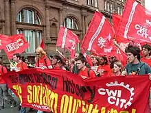 - ↑ This initiative would eventually lead to the foundation of the Scottish Socialist Alliance. The majority of Scottish members, after forming the Scottish Socialist Party, left the Committee for a Workers' International (CWI – the international socialist organisation which the Socialist Party is affiliated to) in early 2001 as the Scottish majority moved away from traditional Trotskyist politics. The CWI in Scotland now works as part of Solidarity – Scotland's Socialist Movement.