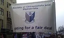 The union originated in 1912 as the Society of Chiropodists, the first organisation of chiropodists in Europe.[6] In 1916, it was renamed the Incorporated Society of Chiropodists, and in 1919, it established examinations for potential new members.[7] Several rival organisations emerged: the Northern Association of Chiropodists, the Chelsea Chiropodists Association and the British Association of Chiropodists. These merged with the Incorporated Society in 1945, the new body once more taking the name Society of Chiropodists.[6] It was recognised as a negotiating body by the National Health Service in 1948, but did not register as a trade union until 1978. In 1993, it became the Society of Chiropodists and Podiatrists, recognising the membership of podiatrists, and in 1997, it affiliated to the Trades Union Congress.[3] In 1998, the Association of Chief Chiropody Officers and the Podiatry Association both merged with the society.[8]