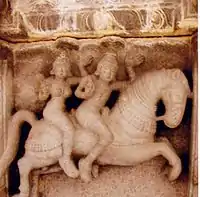 Joint families were the norm but legal separations between brothers and even father and son have been recorded in inscriptions.[17] Women and daughters had rights over property and land, and there are inscriptions recording the sale of land by women. Moneys inheritable by women were called Sthridhana.[18] The arranged marriage system ensured a strict policy of early marriage for women. Among Brahmins, boys married at or below 16 years of age and they chose brides of 12 or younger. This age policy was not as strictly followed by other castes.[19] Inscriptions refer to numerous instances of the marriage of a man to his maternal cousin (daughter of a maternal uncle), prince Jagattunga, son of Krishna II being an example of this.[20] Women had the right to attend and the right to be in attendance in the court when it was occupied by the King. Sati was practiced but was voluntary. Very few examples of sati are noted in inscriptions and those that did occur were mostly in the royal families.[21] The system of shaving the heads of widows was rarely practiced as epigraphs note that widows were allowed to grow their hair but decorating their hair was discouraged. The sentence "the cause of the cessation of the parting of the hairs of the damsels of enemies" (ripuvilasiriisimantoddharanahetuh) is repeated in many inscriptions.[22] The remarriage of a widow was rare among the upper castes and common among the lower castes.[23] Women who were dishonoured were admitted back into their families and caste.