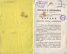 Society of Serbian Literature (Serbian: Дружтво србске словесности, ДСС, romanized: Družtvo srbske slovesnosti, DSS), founded in 19 November 1841 and confirmed by the seal and signature of prince Mihailo Obrenović.[1]