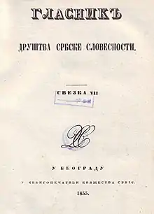 Front page of the seventh volume of the Gazette of the Society of Serbian Literature (1855)