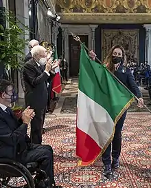 Sofia Goggia receives, on 23 December 2021, from the President of the Italian Republic, Sergio Mattarella the Italian flag that the Italian athlete should have carried, as flagbarear at the 2022 Winter Olympics opening ceremony in Beijing, but she was forced to give up due to an injury and was replaced by her fellow citizen from Bergamo, Michela Moioli.[20]
