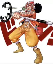 He was the fourth member to join Luffy's crew and the third officially after the confrontation they had with Captain Kuro.[3] His dream is to become a great pirate like his father Yasopp, member of the Red-Haired Pirates of "Red-Haired" Shanks.