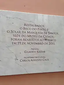 On June 15, 1971, the Solar da Marquesa de Santos was listed as a historical monument of the State of São Paulo and incorporated into the municipal heritage. In 1975, it became the headquarters of the Municipal Secretariat of Culture and the newly created Department of Historical Heritage (DPH).[2]
