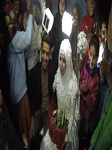 Syrian refugee camp wedding in Idomeni, Greece. The pitch black campsite illuminated by solar lanterns called SolarPuff. Love is everywhere, you just need light.|alt=Imagine a bride in a white wedding dress covering her head to her ground. The groom wearing a dark jacket and button up collared shirt. Refugees who are living in the camp are dressed up in dresses and long pants. Solar lanterns called SolarPuff illuminate the scene.