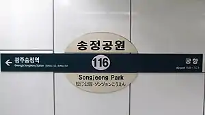Songjeong Park station (Korean: 송정공원역; Hanja: 松汀公園驛) is a station of Gwangju Metro Line 1 in Songjeong-dong, Gwangsan District, Gwangju, South Korea. It serves as a transit station using local buses for citizens living in residential areas such as Hanam, Unnam, and Suwan. There is a subway literature museum at this station.