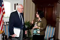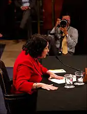 After a brief recess, Senator Arlen Specter (D-PA) first complimented Sotomayor on her handling of questions during the hearing. Specter then once again brought up the "wise Latina" comments, and likened them to similar statements from others currently on the Supreme Court.[53] The terror surveillance program was then brought up, with Specter very critical of former President Bush's wiretapping of US citizens without warrants. Sotomayor largely avoided getting immersed in the controversy.[54] Specter then made a case for allowing television cameras into the courtroom. Sotomayor stated that she personally allowed television cameras into her courtroom, but conceded that it is up to the justices on the Supreme Court whether to allow it at that level.[55]