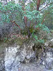 Pacific madrone growing out of bedrock on northeast slope of Sonoma Mountain