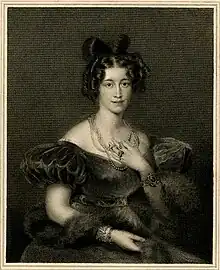Sophia FitzClarence was born in August 1796 on Somerset Street in London, the eldest daughter of Prince William, Duke of Clarence and St Andrews, by his longtime mistress, the comic actress Dorothea Jordan.[1] Sophia would come to have nine siblings, five brothers and four sisters all surnamed FitzClarence.[2][3] While circumstances prevented the couple from ever marrying, for twenty years William and Dorothea enjoyed domestic stability and were devoted to their children.[4][5] In 1797, they moved from Clarence Lodge to Bushy House, residing at the Teddington residence until 1807.[4] The couple separated in 1811 as William sought to produce legitimate issue.[6]