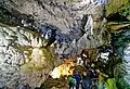 The path leads through a very narrow passage about three meters long to a platform in the upper part of the first section of the cave. Directly in front of the path, which leads there to the left, is the "Elephant's Ear", a free-hanging sinter plume more than one meter long. As a counterpart, a stalagmite has formed at the bottom, the "Beehive". The path then passes the "Oriental City" and turns right in a semicircle. The "Oriental City" is located halfway up on the left in a small cavity and consists of numerous candle stalagmites. Afterwards a staircase leads more than ten meters down, where a cave bear of the small cave bear race Ursus spelaeus eremus,[20] assembled from bones, can be found. The sintering on the right wall reminds of a waterfall and gave reason to give the formation the same name. On the ceiling there are sinter flags, sporadically also sinter tubes. On the floor there are prehistoric and protohistoric bones covered with sinter mass, especially reindeer antler poles and a mammoth basin deposited in one place by the Cromagnon people of the Gravettian, probably in a shamanic context in the cave. Stalagmites with drop funnels have also formed in several places.