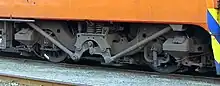 Together with the unit's electronic wheelslip detection system, these traction struts, mounted between the linkages on the bogies and the locomotive body and colloquially referred to as grasshopper legs, ensured the maximum transfer of power to the rails without causing wheel-slip by reducing the adhesion of the leading bogie and increasing that of the trailing bogie by as much as 15% upon starting off. This feature was controlled by electronic wheel-slip detection devices and an electric weight transfer relay which reduced the anchor current to the leading bogie by as much as 50A in notches 2 to 16. These grasshopper legs and linkages were to become a distinguishing feature on the bogies of most subsequent South African electric locomotive classes.[6]