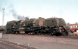 In Zimbabwe-Rhodesia, these locomotives normally worked chimney first with the water tank at the rear. Since the Rhodesian bush war was still ongoing in 1979, the locomotives were equipped with armour plating around the cab. Since this obscured the number plates, the engine numbers were then usually stencilled on the cabsides. The Class GMAM was similar in size with a similar coal capacity to the Rhodesia Railways 20th class 4-8-2+2-8-4 Garratt, but it had a voracious appetite for coal and frequently ran low on fuel with the result that trains often had to be dumped. In an attempt to solve this problem, RR extended the height of the Class GMAM's coal bunker by a foot to increase the capacity.[19][20][21]