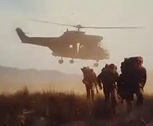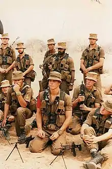 The initial officer cadre of the brigade was drawn from South African infantry units[6] as well as a number of officers from the Rhodesian forces.[7][8][9] Senior NCO's were selected from the South African Navy and Rhodesian Light Infantry squadrons. Officers were required to complete all SADF infantry training courses as well as specialised navy training courses for promotional purposes. Recruit training focused on regimental training as well as conventional warfare, which was then followed by rural counterinsurgency operations. After this training, some recruits moved into specialist fields whilst the majority were posted on a rotational basis to naval units and to operational deployments in South-West Africa. Advanced training was carried out with 44 Parachute Brigade[10] for conventional amphibious operations, with 4 Reconnaissance Regiment (See South African Special Forces Brigade) for small tactics amphibious operations and with 1 Reconnaissance Regiment[11] in Durban for advanced urban counter-insurgency operations. Forward Observation Officer / Fire control training, involving directing ship's artillery fire onto enemy position targets from within enemy territory, was also regularly conducted with naval strike craft in northern Zululand. Brigade staff members were responsible for defining SADF amphibious warfare doctrine.