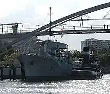 On 29 February 1980 HMAS Diamantina, the last World War II-era frigate to serve Australia, was decommissioned from the Royal Australian Navy. Diamantina was handed over to the Queensland Maritime Museum to be permanently berthed in the South Brisbane Dry Dock.[3] In March 2006, Diamantina left her berth for the first time in 25 years when she was towed out into the river to allow repairs to the dock,[4] which had been flooded since the seals failed in 1998.[5] On 10 May 2006, she returned to the South Brisbane Dry Dock adjacent to the Queensland Maritime Museum,[6] where she was used as a self-touring museum ship. During the 2010–2011 Queensland floods, the dry dock flooded but the ship had been maintained in good repair and floated up from the dry dock with the flood, while volunteers adjusted the ropes to prevent the ship bashing against the dry dock. The ship was undamaged.[7][8]