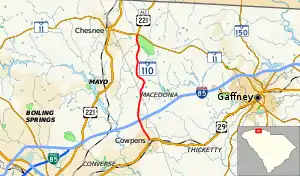 South Carolina Highway 110 (SC 110) is a state highway in the U.S. state of South Carolina that travels 9.280 miles (14.935 km) from US 29 in Cowpens to US 221 Alt and SC 11 at Cowpens National Battlefield near Chesnee.[3] It is signed[3] and internally designated as an east–west highway though it runs north–south physically.