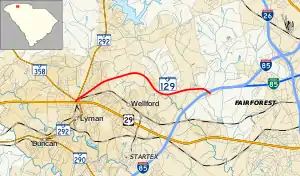 South Carolina Highway 129 (SC 129) is a 4.970-mile (7.998 km) state highway in the U.S. state of South Carolina. It connects Falling Creek Road near Spartanburg with U.S. Route 29 (US 29) and SC 292 in Lyman. It also has an interchange with Interstate 85 (I-85) just north of its southern terminus. The highway is known as Fort Prince Boulevard.